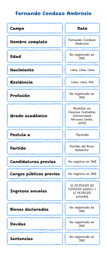 En Ate, distrito donde declara su domicilio, Fernando Condezo Ambrosio figura en el registro electoral con una formación en contabilidad y un reporte de ingresos repartidos entre el sector público y privado. En su hoja de vida presentada ante el Jurado Nacional de Elecciones (JNE), no consigna experiencia laboral en el apartado correspondiente. Hoy aparece como candidato a diputado por el Partido del Buen Gobierno. Su declaración jurada también señala que no registra bienes ni sentencias en los campos visibles del formato.