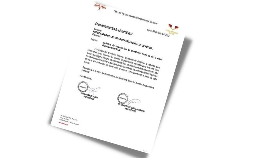 Mediante el Oficio Circular N° 006-SCFA-FPF-2022, emitido el 8/Jul./22, expresa que: “Teniendo en cuenta la prohibición existente para los directores técnicos para dirigir o integrar comandos técnicos de dos clubes o más en el mismo año, resulta necesario solicitar a las ligas departamentales, los nombres de los directores técnicos y/o comandos técnicos, para el control correspondiente a partir de esta etapa”.