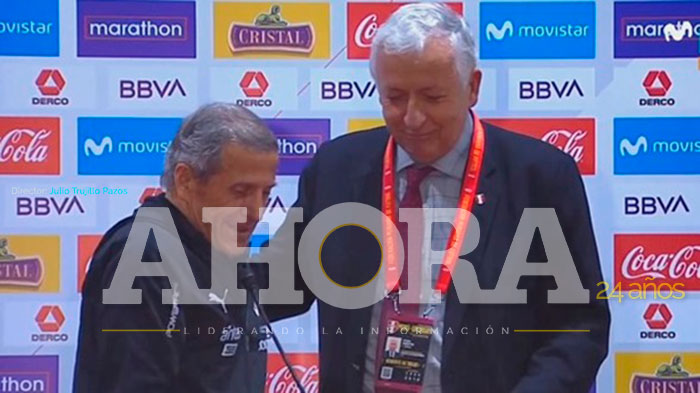 Finalizada la conferencia de prensa del ‘Maestro’, apareció el gerente de selecciones, Antonio García Pye, quien luego de unas palabras al experimentado entrenador, le hizo entrega de un Retablo Ayacuchano como regalo.