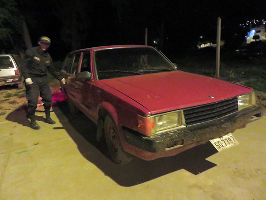 Una hora después, Miluer Alberto Calderón (26) llegó a la comisaría e indicó ser propietario del vehículo Toyota Corona rojo de placa SO-7397 usado en el secuestro. Explicó que a las 6:30 de la tarde tres sujetos lo encañonaron y le robaron el vehículo a la altura del cuartel Yanag