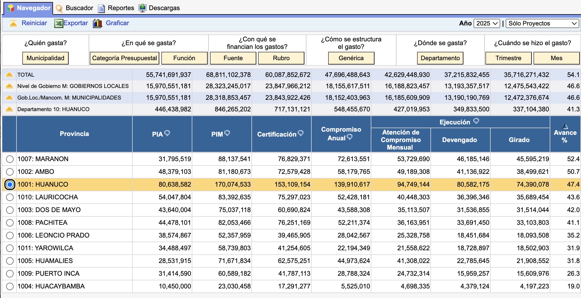 Según el portal del Ministerio de Economía y Finanzas, al 2025 la Municipalidad Provincial de Huánuco registra un avance de ejecución del 47.4% de su Presupuesto Institucional Modificado (PIM), equivalente a 80.5 millones devengados de un total de 170 millones de soles disponibles para proyectos de inversión.