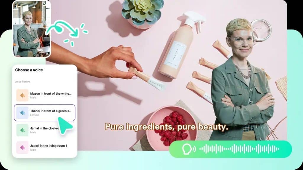 La IA alinea tus imágenes y texto descriptivo en un video listo. Ajusta automáticamente transiciones, ritmo y calidad. También verás avatares, subtítulos, voces y otros elementos agregados.