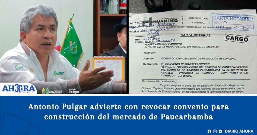 El gobernador regional de Huánuco, Antonio Pulgar, notificó a la Municipalidad Distrital de Amarilis sobre el incumplimiento de sus obligaciones dentro del Convenio N° 001-2023-GRH/GR, que establece la construcción y mejora del mercado de abastos de Paucarbamba.