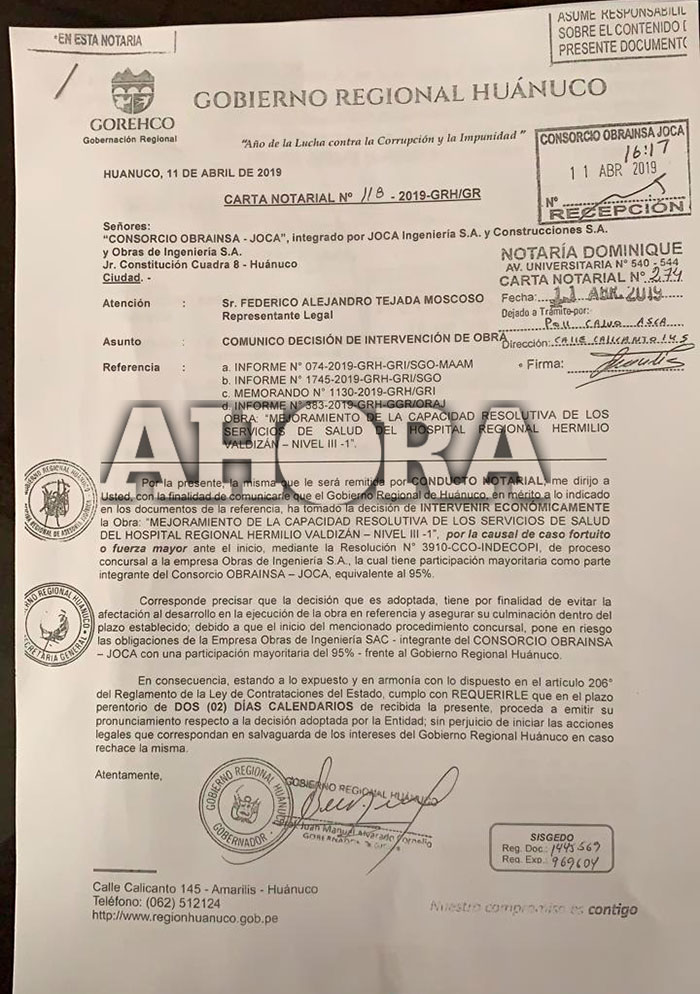 Reconoció que en la Carta Notarial n.° 118-2019-GRH/GR, suscrita por el gobernador regional con fecha 11 de abril, se comunicó al Consorcio Obrainsa-Joca la decisión de proceder a la Intervención Económica de la obra, por causal de caso fortuito o fuerza mayor, la cual fue objetada por el Consorcio Obrainsa-Joca con la Carta n.° PO259-05-CGRH-CG-082 del 17 de abril, con argumentos que se analizaron desde el punto de vista legal. Sin embargo, también es cierto que con posterioridad a esta fecha se efectuaron consultas directas al titular de la Contraloría General de la República, a la Superintendencia de Banca y Seguros y Chubb Seguros S.A., que han permitido recibir información valiosa que obligan a analizar a profundidad antes de tomar la decisión final que puede afectar la continuación de la obra y su culminación antes de terminar el presente año como ha previsto el equipo técnico.
