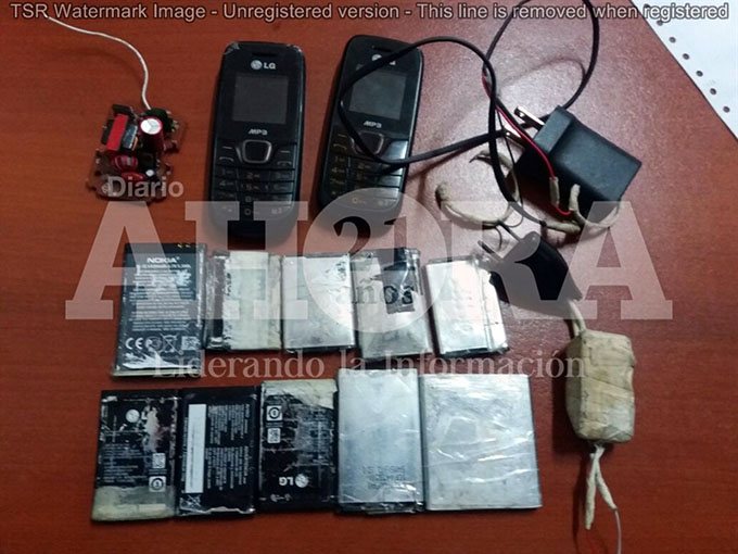 Los trabajadores encontraron dos teléfonos celulares LG ocultos en el segundo piso del indicado pabellón. Asimismo hallaron tres baterías en el pasadizo del primer piso, a la altura de la última celda debajo de un televisor. Finalmente encontraron otras siete baterías y tres cargadores dentro de una bolsa plástica en el patio de dicho pabellón.