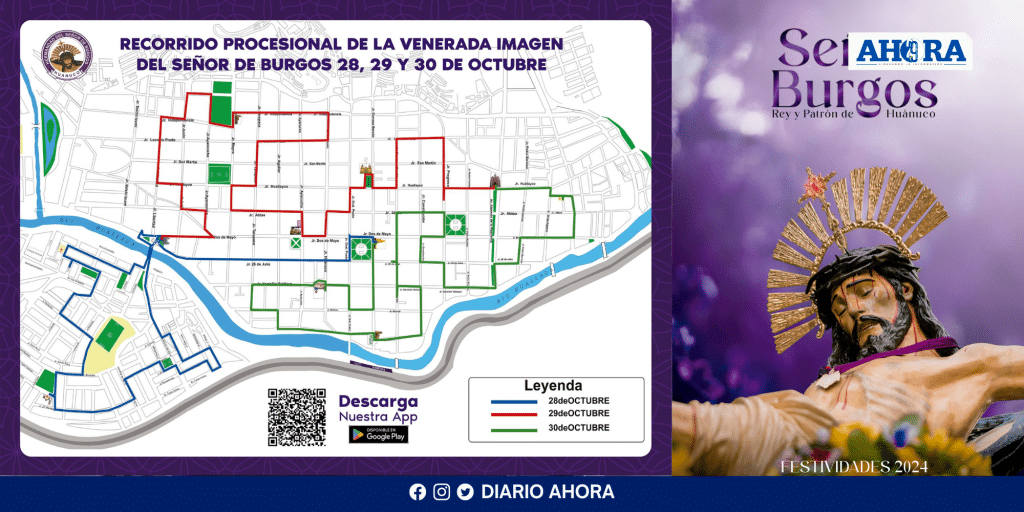 Uno de los eventos más esperados es la procesión de la venerada imagen del Señor de Burgos, que recorrerá las principales calles de Huánuco los días 28, 29 y 30 de octubre, tal como indica el detallado mapa publicado por la Hermandad. Esta procesión es un momento clave para la comunidad, que acompaña con fervor la imagen sagrada, convirtiendo las calles en un verdadero espacio de oración y reflexión.