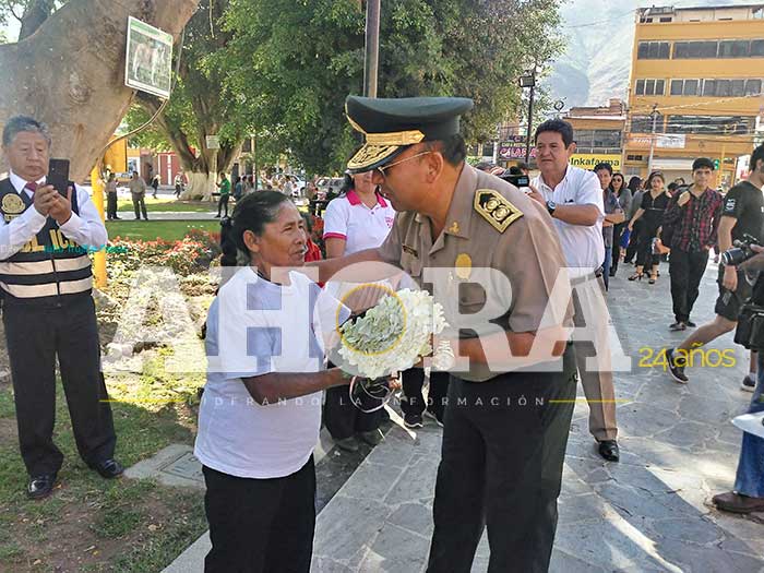 También el general PNP Carlos Tineo Crispín, jefe de la V Macrorregión Policial, saludó a las mujeres en este día y entregó un ramo de flores a todas las mujeres que asistieron a la ceremonia.