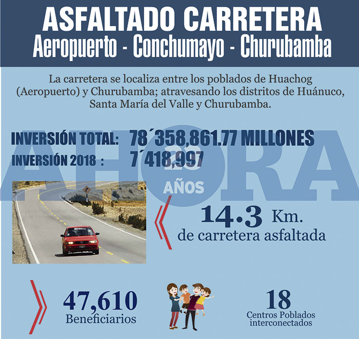 Explicó que la obra beneficiará a más de 43 mil pobladores de 18 pueblos de los distritos de Huánuco, Santa María del Valle y Churubamba, y se ejecutará con una inversión de S/78 358 861, de los cuales en el presente año se invertirán S/7 418 997 para el tramo aeropuerto-puente Conchumayo; el resto se incluye en el presupuesto multianual de los años 2019, 2020 y 2021. La obra consiste en el ensanche, asfaltado de la carretera de 7.20 m de ancho, con una vía de dos carriles e inclusive la construcción de dos puentes.