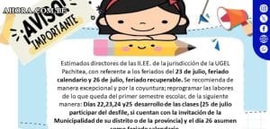El gerente de desarrollo social, Aldo Reyes, manifestó tras una reunión sostenida entre la Red de Salud y los directores de las Unidades de Gestión Educativa Local (UGELs), que el día de hoy se abordará la situación con los directores de las instituciones educativas que se encuentran prestando servicios para atender pacientes COVID-19, ya que probablemente no se podrán regresar para el inicio de clases.