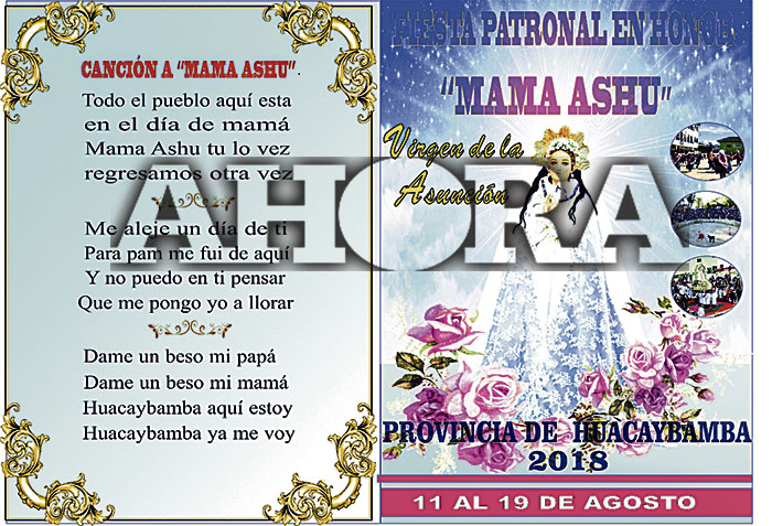Esta tarde se inician los festejos en homenaje a la Mama Ashu o Virgen de la Asunción que es la santa patrona de la provincia de Huacaybamba, motivo por el cual han elaborado un amplio programa de actividades que se prorrogarán hasta el domingo 19, informó el alcalde Policarpo Edgar Benites Medrano.