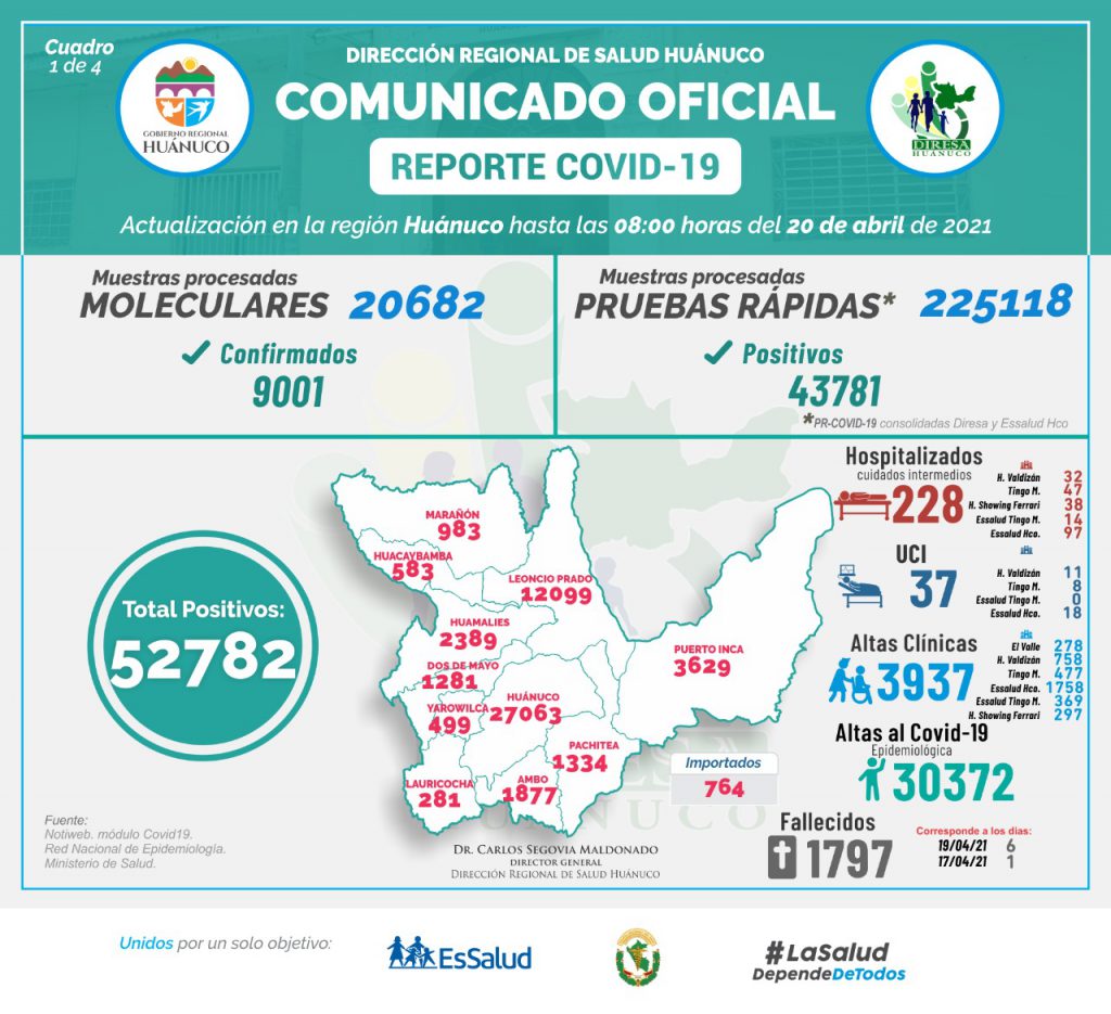 Un total de 149 nuevos casos y 7 fallecidos por la COVID-19, fueron detectados por las autoridades sanitarias en la región de Huánuco, según datos actualizados hasta las 08:00 horas del día 20 de abril.