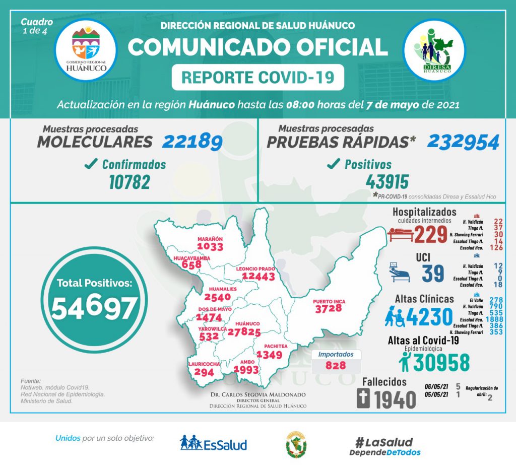 Un total de 110 nuevos casos y 8 fallecidos por la COVID-19, fueron detectados por las autoridades sanitarias en la región de Huánuco, según datos actualizados hasta las 08:00 horas del día 07 de mayo.
