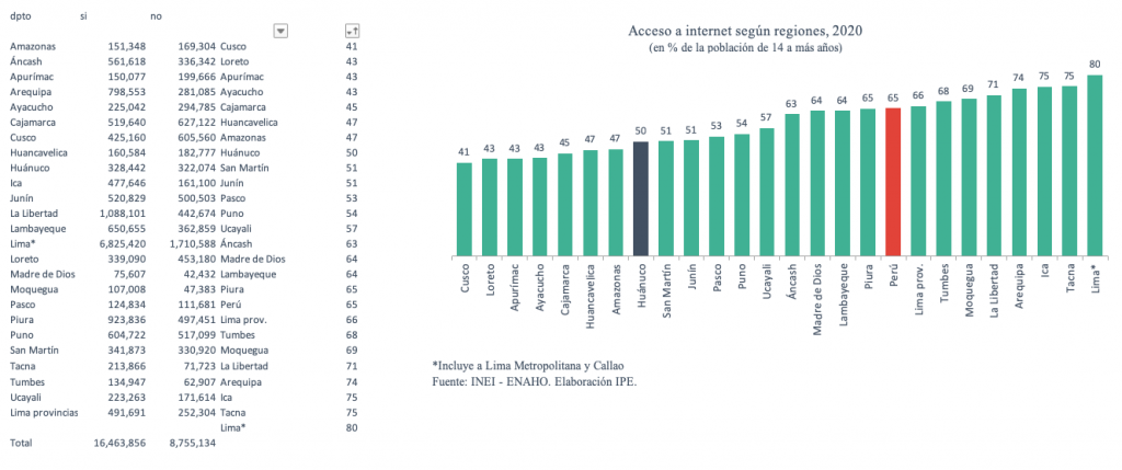 Las medidas de aislamiento social en el contexto de la pandemia han conllevado que un gran número de personas pasen a estudiar y/o trabajar de manera remota, por lo que el acceso a Internet ha cobrado especial relevancia. Así, entre el 2019 y 2020, el porcentaje de peruanos de 14 años a más de edad que hizo uso de Internet se incrementó de 60.0% a 65.3%. Igualmente, el uso de este servicio en Huánuco se amplió de 42.3% a 50.5%, lo que representa un incremento de más de 56 mil usuarios.