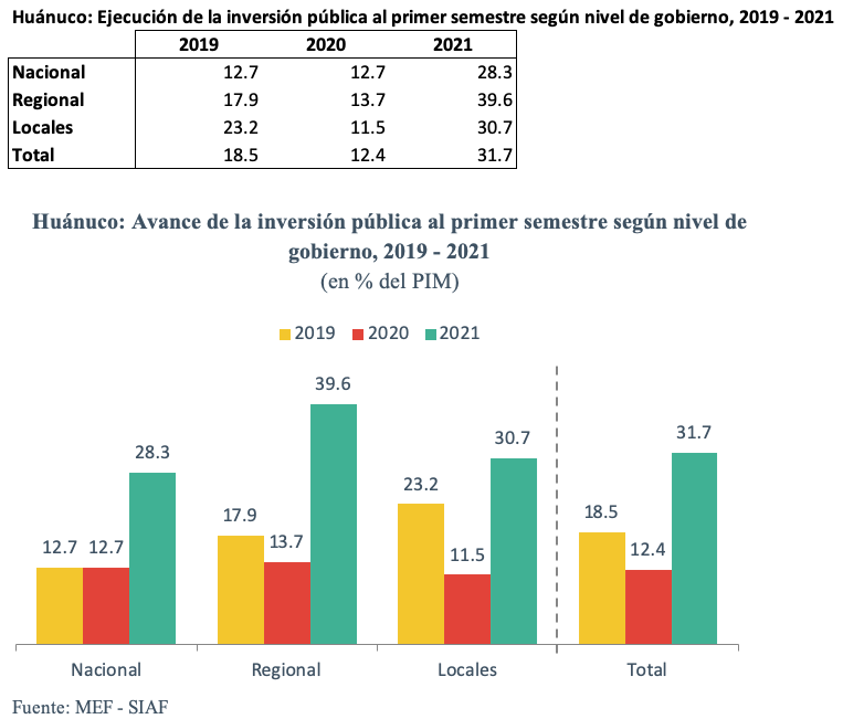 Según niveles de gobierno, el Gobierno regional presenta el mayor avance de la inversión (40%) en este periodo. Ello se atribuye al mayor gasto en proyectos de educación y salud, entre los que resalta el avance de 63% del presupuesto asignado este año al proyecto de mejoramiento del Hospital Regional Hermilio Valdizán. Por su parte, el Gobierno nacional y los gobiernos locales registran porcentajes de ejecución de 28% y 31% respectivamente.