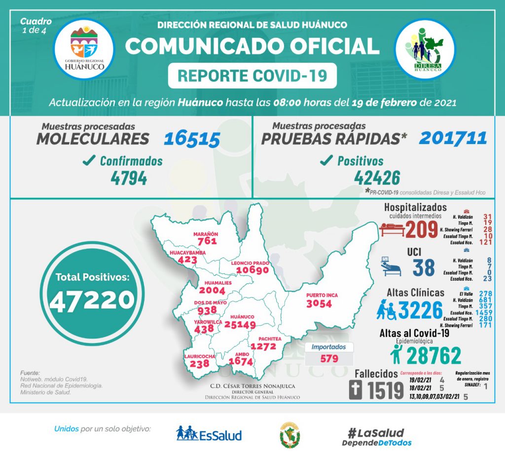 Continúa disminuyendo los casos positivos por coronavirus en la región de Huánuco, según el último reporte de la Diresa, en tan solo un día hubo 66 infectados, una baja considerable en relación a las semanas pasadas.