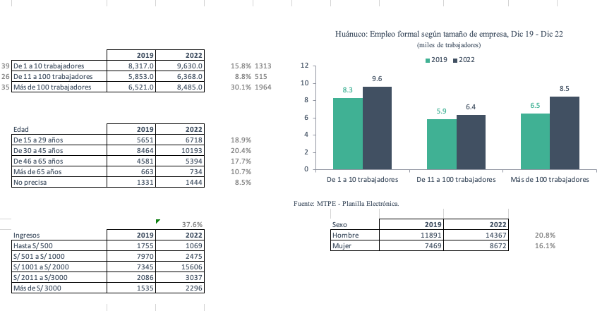 Al finalizar el 2022, la cantidad de puestos de trabajo formales en el Perú ascendió a 4.1 millones, superando los 3.8 millones registrados en diciembre de 2019. Esto indica un crecimiento de 7.3% en comparación con la situación prepandemia. A pesar de esto, el avance del empleo formal no ha sido el mismo en todas las regiones del país, En este sentido, analicemos la evolución del empleo formal en Huánuco, utilizando datos de la Planilla Electrónica del Ministerio de Trabajo.