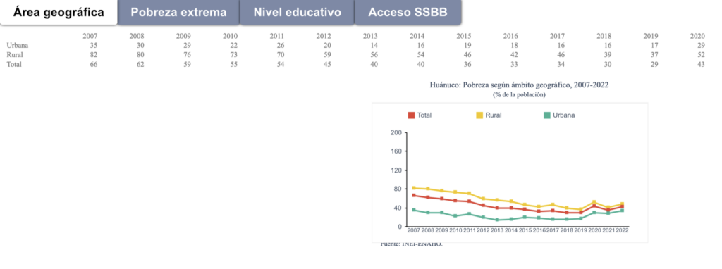 Al desagregar la pobreza por ámbito geográfico, se puede observar que el 47.7% de la población rural de Huánuco vive en la pobreza, lo cual representa un incremento de 10.4 puntos porcentuales desde 2019. La pobreza urbana en la región ha aumentado en mayor magnitud, alcanzando un 34.3% en 2022, lo que supone un aumento de 16.8 puntos porcentuales respecto a la prepandemia.