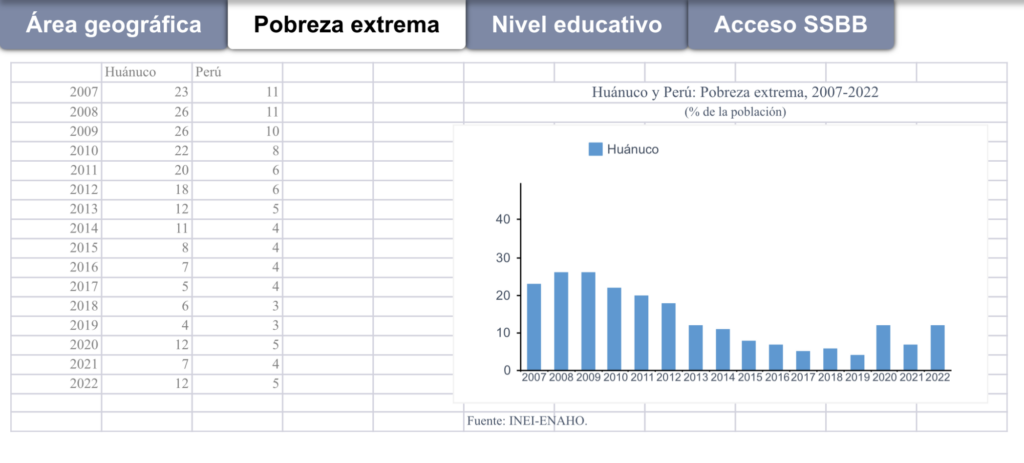 Peor aún, la desaceleración económica y la alta inflación del 2022 ocasionaron que la pobreza se incremente a 27.5% a nivel nacional. Asimismo, en Huánuco también aumentó la nivel pobreza a 42.2% en 2022, con lo que se ha convertido en la segunda región más pobre del país solo por encima de Cajamarca (44.3%).
