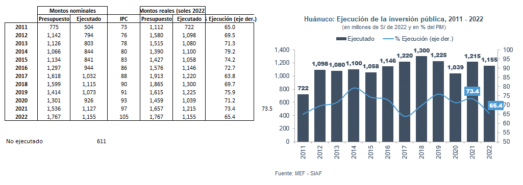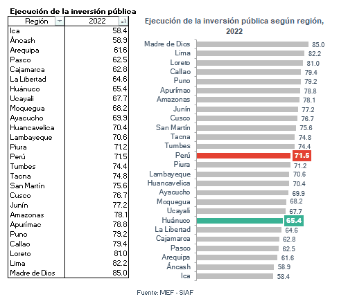 La inversión pública a nivel nacional ascendió a S/47 234 millones durante el 2022, logrando ejecutar el 71.5 % del presupuesto asignado. Sin embargo, a nivel regional, se observaron diferentes niveles de avance. Para Huánuco, la tasa de ejecución de los recursos asignados a inversión pública se ubicó como la séptima más baja a nivel nacional.