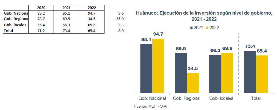 Por su parte, el Gobierno Regional de Huánuco solo ejecutó el 34,5 % de su presupuesto en 2022. Ello supone un gran retroceso ya que en 2021 se invirtió el 69.5 % del presupuesto.