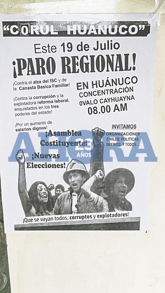 Para hoy se convocó a un paro nacional de 24 horas que también será acatado en Huánuco en protesta contra la corrupción generalizada que afecta las más altas esferas del sistema judicial como también a congresistas de la República, lo que ha motivado la inmediata respuesta de rechazo de diversos sectores sociales y económicos del país.
