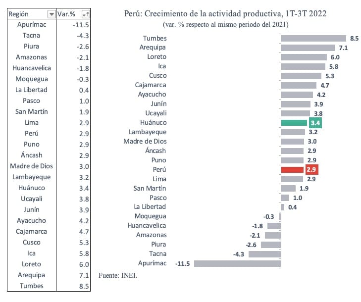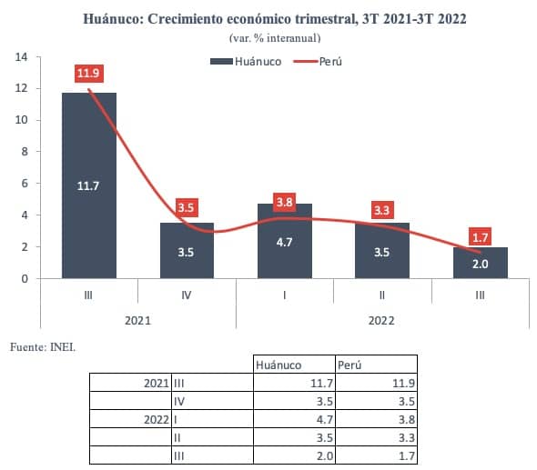 Al considerar el crecimiento acumulado hasta el tercer trimestre, Huánuco creció 3.4 % respecto al 2021 durante este periodo, lo que la convierte en la décima región que más creció en el país. Respecto a su situación prepandemia, la actividad económica de la región se encuentra 1.8 % por encima.