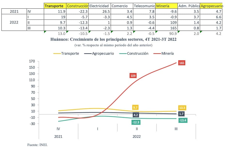 El crecimiento en Huánuco durante el tercer trimestre de este año estuvo impulsado por el notable crecimiento del sector minería (165 %). Es el segundo trimestre consecutivo en el que la producción minera de la región crece en más de 100 % interanual. Este auge minero se explica por el aporte de la Compañía Minera Raura, la cual empezó a operar en abril de este año en la producción de cobre, zinc, plata y plomo, tras haber paralizado sus actividades desde el 2020.