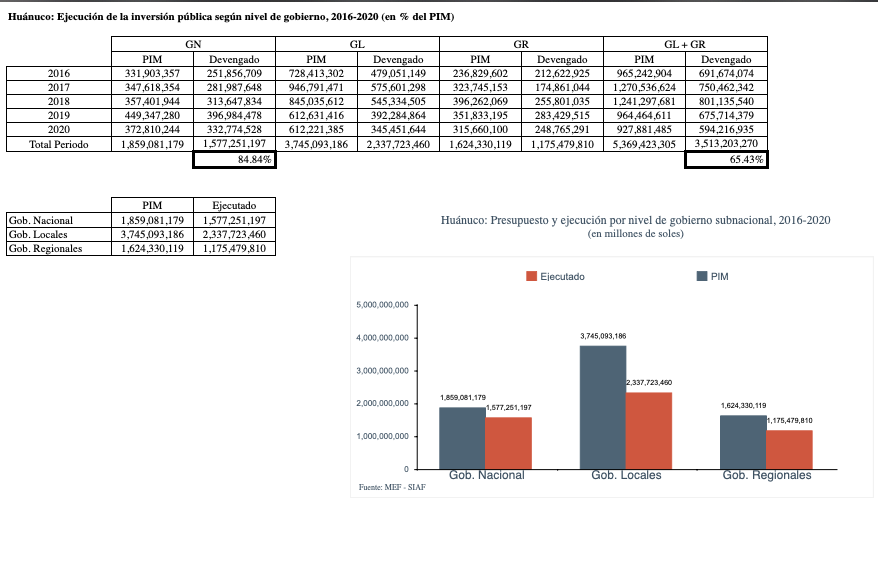Ello se evidencia en la menor capacidad de los gobiernos subnacionales para hacer uso de sus recursos disponibles. Por ejemplo, en Huánuco, entre los años 2016 y 2020, los gobiernos locales y regionales no ejecutaron alrededor del 35% de su presupuesto para inversión pública, dejando de invertir aproximadamente S/ 2 mil millones en el total de los 5 años mencionados. Si bien el Gobierno Nacional también presenta problemas de ejecución, el porcentaje no ejecutado de su presupuesto para inversión en dichos años es menor (15%).
