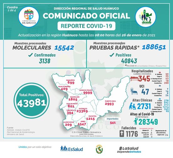 El reporte de la Dirección Regional de Salud, indica que el coronavirus en la región de Huánuco ha dejado un total de 24 fallecidos y 256 ciudadanos contagiados en 24 horas, mientras que un total de 345 personas se encuentran hospitalizadas y 47 en UCI. El informe de la Diresa es actualizado hasta este 26 de enero, hasta las 08:00 horas.