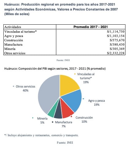 En Huánuco, las actividades vinculadas al turismo (alojamiento, restaurantes, transporte y comercio) representan alrededor de 19% de la producción total de la región. Este aporte ha venido decreciendo ligeramente en los últimos diez años, por lo que se requiere seguir con los esfuerzos para fomentar la actividad turística.