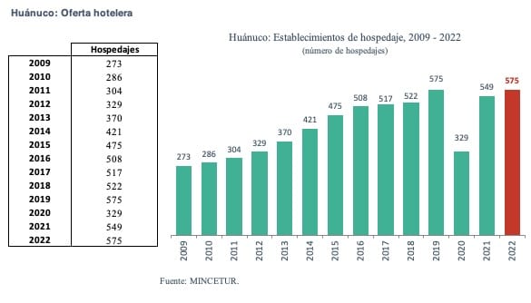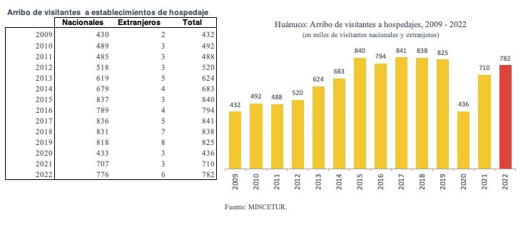 Según el Ministerio de Comercio Exterior y Turismo (Mincetur), en 2019, Huánuco recibió 825 mil visitantes nacionales y extranjeros en sus establecimientos de hospedaje. Esta cifra se redujo 47% en 2020 a raíz de la pandemia, cuando solo arribaron 436 mil visitantes. Para el 2021, el número de arribos aumentó a 710 mil en los hospedajes de la región y al cierre del 2022, ascendió a 782 mil personas, cifra inferior al nivel prepandemia.