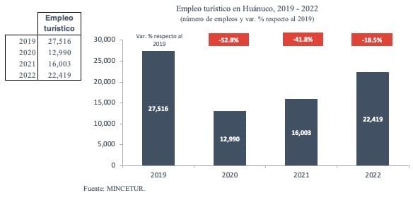La crisis de la Covid-19 generó impactos negativos sobre el turismo en la región debido a las restricciones de aislamiento social obligatorio. En 2022, el empleo en este sector cayó 18.5% respecto al 2019, lo cual significó que más de 5 mil huanuqueños perdieron sus puestos de trabajo. Si bien el turismo en Huánuco se viene recuperando, los arribos a hospedajes, el empleo turístico y las visitas a las principales atracciones turísticas aún no alcanzan sus niveles prepandemia.