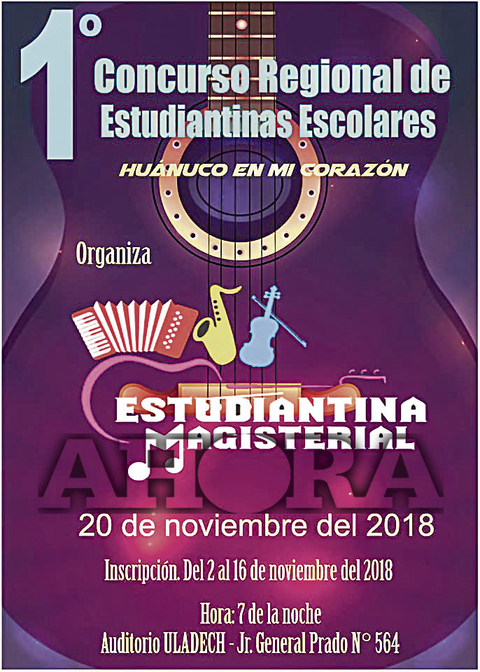 Por primera vez en Huánuco, este martes 20 de noviembre se llevará a cabo el I Concurso Regional de Estudiantinas Escolares “Huánuco en mi corazón”, organizado por la agrupación musical Estudiantina Magisterial de Huánuco con el objetivo de promover y difundir la música tradicional huanuqueña como los huaynos, chimayches, mulizas, yaravíes, valses y marineras, en los niños y jóvenes de nuestra región. Además, estimular a los intérpretes y compositores a la investigación y desarrollo creativo de la música tradicional huanuqueña.