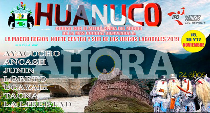 El Instituto Peruano del Deporte ha designado a la ciudad de Huánuco como se de la etapa nacional de los Juegos Laborales 2019, que se realizará los días 15, 16 y 17 de noviembre, con la participación de delegaciones de todo el país, en el evento denominado “Juegos de la Macrorregión Norte, Centro y Sur de los Juegos Laborales 2019”, en las disciplinas de fútbol libre y máster, voleibol damas y mixto, básquetbol libre y mixto, futsal damas y varones libre y máster.