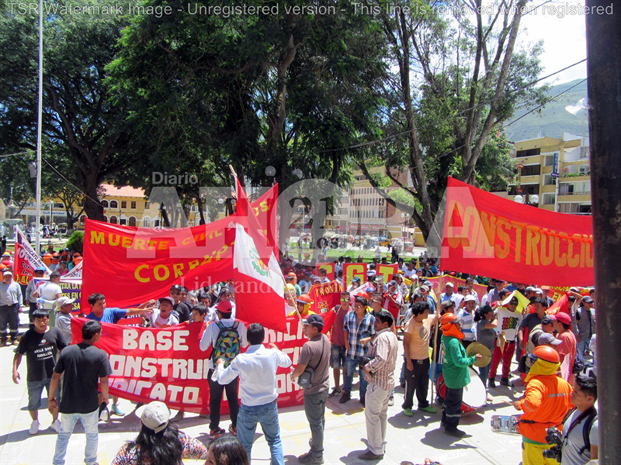 La primera marcha se desarrolló a partir de las 9:30 de la mañana, con recorrido por las calles céntricas de la ciudad hasta la Plaza Mayor, donde improvisaron un mitin y los dirigentes lanzaron críticas contra los expresidentes de la República y políticos, por la coyuntura que sacude al país por los escándalos de corrupción. En esta marcha se concentraron trabajadores del Sindicato Regional de Construcción Civil, de la Municipalidad de Pillco Marca, CGTP y otros gremios.