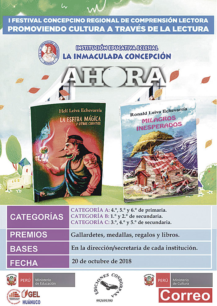 Como parte de las actividades por los 171 años de creación de la Institución Educativa Eclesial “La Inmaculada Concepción”, este sábado 20 se realizará el Primer Festival Concepcino Regional “Promoviendo cultura a través de la lectura”, además de un concurso de lectura en el que podrán participar diversas instituciones educativas y privadas del departamento. El concurso se realizará en 3 categorías: A: Niños de 4° a 6° de primaria, quienes leerán el libro “Milagros Inesperados” de Ronald Leiva Echevarría; B: 1° y 2° de secundaria y C: 3°, 4° y 5° de secundaria, quienes leerán el libro “La esfera mágica” de Ronald Leiva Echevarría.