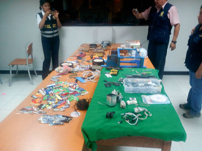 En la requisa y registro personal a cada interno, incautaron 11 teléfonos celulares, memorias chip, baterías, además de objetos punzocortantes y otros objetos prohibidos, que estaban escondidos en los diferentes ambientes del centro reclusorio huanuqueño.