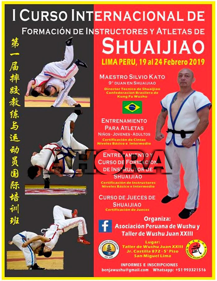 Jorge Ríos Soria, faja negra 5to tuan, técnico huanuqueño de kung fu, participará en el “1º Curso Internacional de Formación de Entrenadores y Atletas de Shuaijiao”, desde el martes 19 al domingo 24 de febrero en el taller de Wushu del Colegio Peruano Chino Juan 23. Será dirigido por el maestro Silvio Kato, grado de 9º tuan en Shuaijiao y director técnico de Shuaijiao de la Confederación Brasilera de Kung fu Wushu.