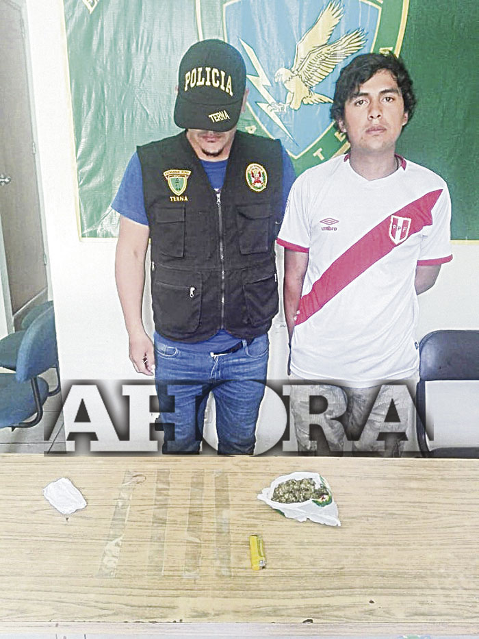 Policías del grupo Terna detuvieron a Jean Pier Sánchez Pérez (23) al sorprenderlo en posesión de una bolsa conteniendo marihuana. La intervención ocurrió ayer al mediodía en el pasaje Perricholi en la cuadra 8 del jirón 28 de Julio, frente a la sede del Reniec.