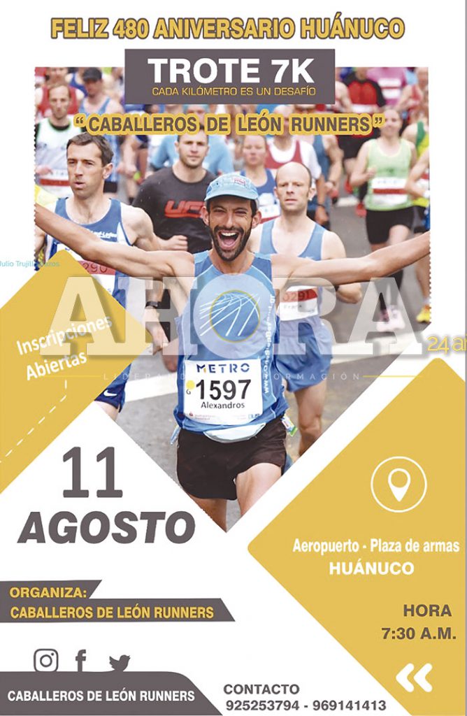 El club “Los Caballeros de León Running”, invita a los aficionados a las pruebas de resistencia, deportistas, estudiantes y personas de ambos sexos sin límite de edad, a la prueba amistosa de resistencia trofeo final damas y varones, a correr por la carretera asfaltada entre el aeropuerto “David Figueroa Fernandini” y la Plaza Mayor de Huánuco sobre una distancia de 7.8 kilómetros de distancia, este domingo 11 de agosto desde las 9.00 de la mañana.
