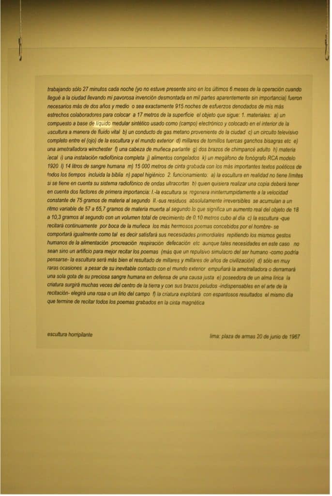 Recuerdo la mañana en que con Alberto Servat y Charles Miroquesada conversamos sobre la posibilidad de exhibir obra de Eielson, una locura, todos nuestros ojos brillaron de emoción. Como todo evento que conlleva una investigación seria, el proyecto tuvo el tiempo que debía tener, se consideró que la misma, estuviera enmarcada en el contexto del centenario del nacimiento del artista y fuera, entre los ambiciosos homenajes realizados a nivel internacional, uno que se sumara en la justa medida y aportara en torno a los afamados “Quipus eielsonianos”. Las expectativas fueron compensadas con creces. La exposición es una impecable prueba del trabajo articulado, sobre todo, la evidencia de cómo funciona bien una maquinaria cuando cada parte cumple lo que le corresponde y los aliados estratégicos suman. Como cocurador de la misma, agradezco a Rodrigo Vera, el compañero en este viaje, por su compromiso, entereza, sobre todo talento. Al equipo del ICPNA, nombres como: Kate, Steve, Luis, Jorge, Christian, Iván, Rubén, jóvenes valiosos y solucionadores de problemas.