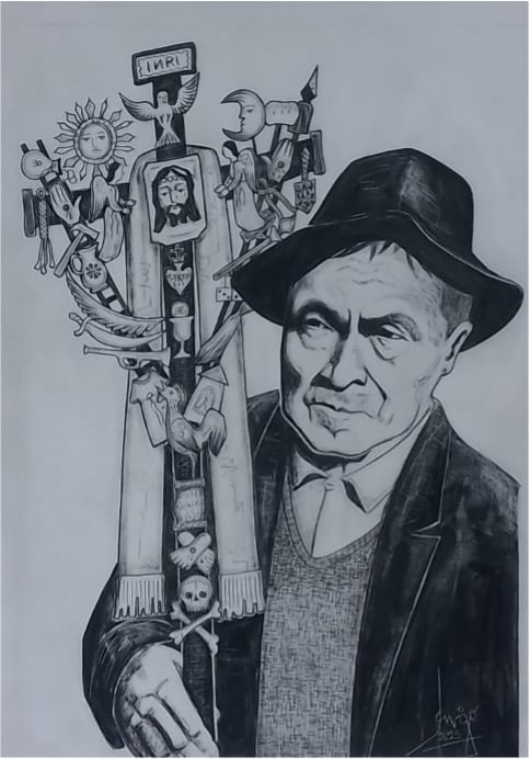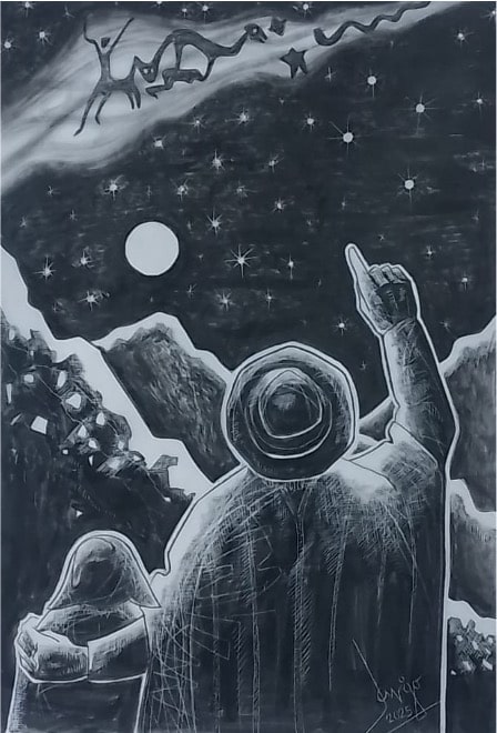 Javier Gonzales va más allá, sus imágenes son crónicas donde transitan motivos de sus afectos, en uno, el dibujo se sale de la hoja acercándose al observador, como en una procesión, es su abuelo Abilio Gonzales quien carga un “tayta mayu”, cruz de fiesta, elaborada por él; en otro, muestra de espaldas a un niño y un adulto, quien con la mano extendida le muestra la vía láctea, el río celestial donde recorren: pastor, zorro, llama, serpiente, perdiz, sapo… Creaturas del panteón andino, el afecto trasmite el conocimiento astronómico ancestral, ese niño y ese adulto es Javier. Entonces en él, la nostalgia es reflexión, rito y presencia actual.