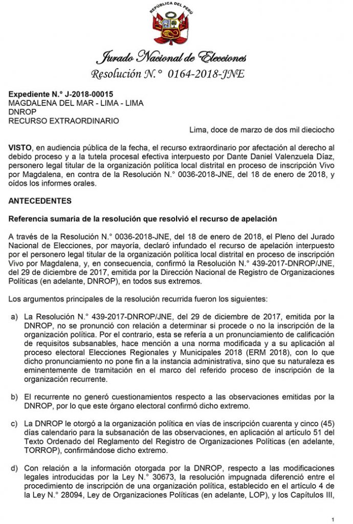 Esta decisión se produce a partir del documento presentado por Dante Daniel Valenzuela Díaz, personero legal de la organización política local distrital Vivo por Magdalena, quien interpuso el recurso extraordinario ante la afectación del derecho al debido proceso y a la tutela procesal efectiva, y como mecanismo de impugnación de las decisiones del Jurado Nacional de Elecciones.
