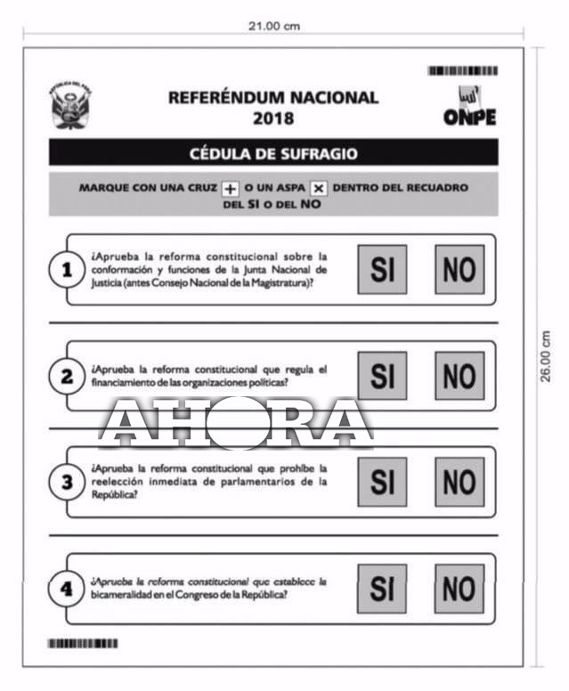 El referéndum consultará a la población 4 preguntas: ¿Aprueba la reforma constitucional sobre la conformación y funciones de la Junta Nacional de Justicia (antes Consejo Nacional de la Magistratura) ?, ¿Aprueba la reforma constitucional que regula el financiamiento de las organizaciones políticas?, ¿Aprueba la reforma constitucional que prohíbe la reelección inmediata de parlamentarios de la República? y ¿Aprueba la reforma constitucional que establece la bicameralidad en el Congreso de la República?.