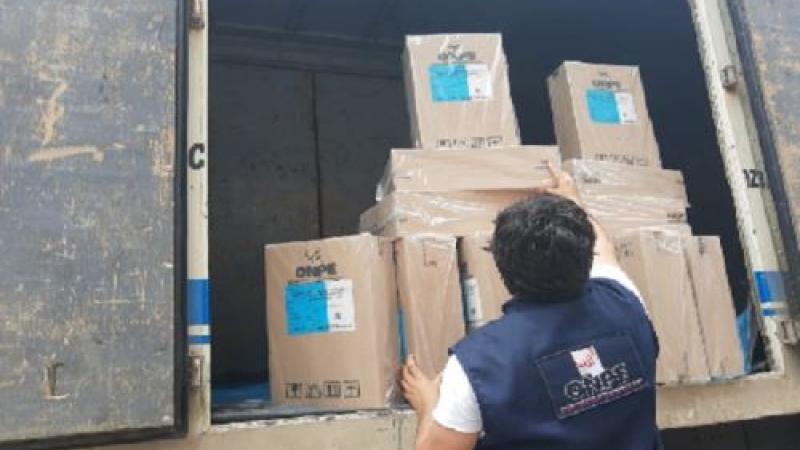 A través de un camión custodiado por la Policía Nacional y un comisionado enviado desde Lima, se recibieron 351 paquetes que contienen cédulas de sufragio, actas electorales, lapiceros, ánforas, cabinas de votación, entre otros.