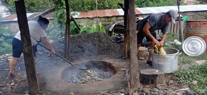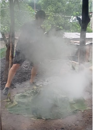 Doña Maura y don “Mele” colocan una cama de piedra al fondo de la olla de tierra, vierten la yucas y se cubre con otra capa de piedras, sobre eso se coloca la carne aderezada la noche anterior; la piel del cerdo va pegado a las piedras; entre los huesos se colocan algunas piedras; se añade el jugo donde se maceró la carne, se derrama la papa y el camote a los rededores del cerrito que se ha formado, todos los ingredientes descansan sobre la olla de tierra fértil, don “Mele” toma entre sus manos las hojas de plátano y las coloca ordenadamente alrededor del cerrito hecho ahora de piedras, carne, papas, camote y yuca.
