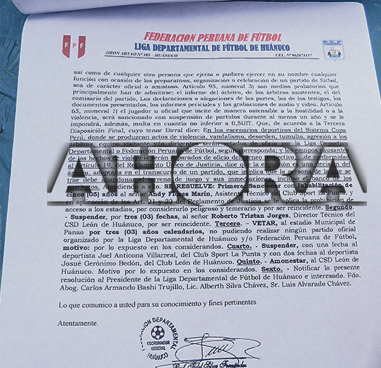 El dirigente Fidel Silva, llevó copias de la resolución al estadio y lo entregó al delegado del club León de Huánuco.