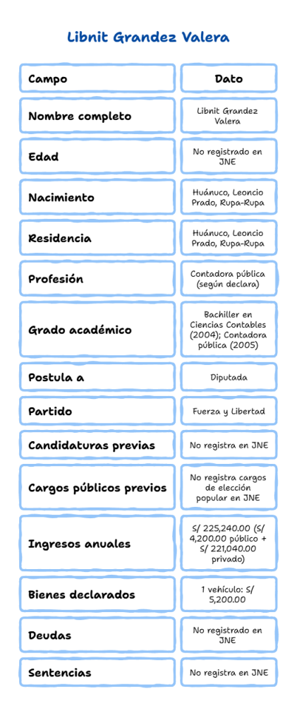 En Rupa-Rupa, distrito de Leoncio Prado donde nació y vive, Libnit Grandez Valera ha desarrollado una trayectoria ligada a la administración pública local. Su hoja de vida la ubica en puestos de tesorería y apoyo administrativo en municipalidades y proyectos de inversión en Huánuco. Hoy aparece en la contienda electoral como candidata a diputada por el partido Fuerza y Libertad. En su declaración jurada ante el Jurado Nacional de Elecciones (JNE) consigna sus ingresos anuales, un bien vehicular y que no registra sentencias.