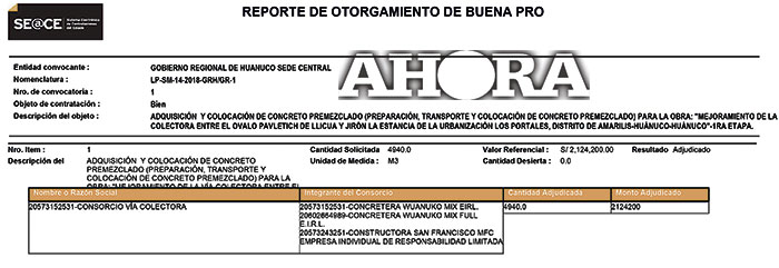 El consorcio Vía Colectora integrado por Concretera Wuanuko Mix E.I.R.L., Concretera Wuanuko Mix Full E.I.R.L. y la Constructora San Francisco, resultaron ganadores de la licitación de la adquisición y colocación de concreto premezclado para la Vía Colectora, según la decisión del comité de licitación del Gobierno Regional.