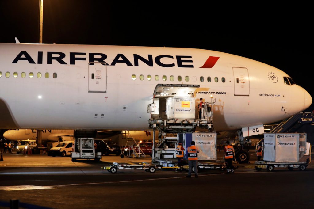 El personal del Aeropuerto Internacional inició la descarga de los contenedores de temperatura controlada (envirotainers), empleados para trasladar las vacunas de Sinopharm entre 2° y 8°C.
